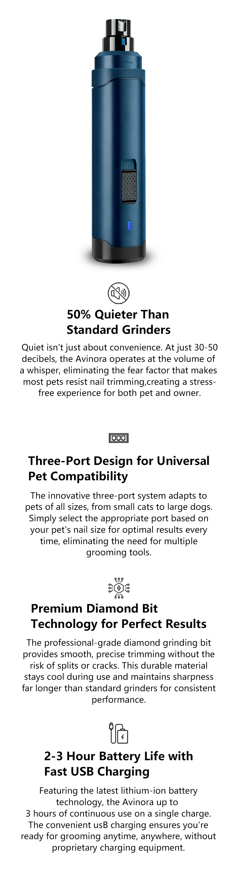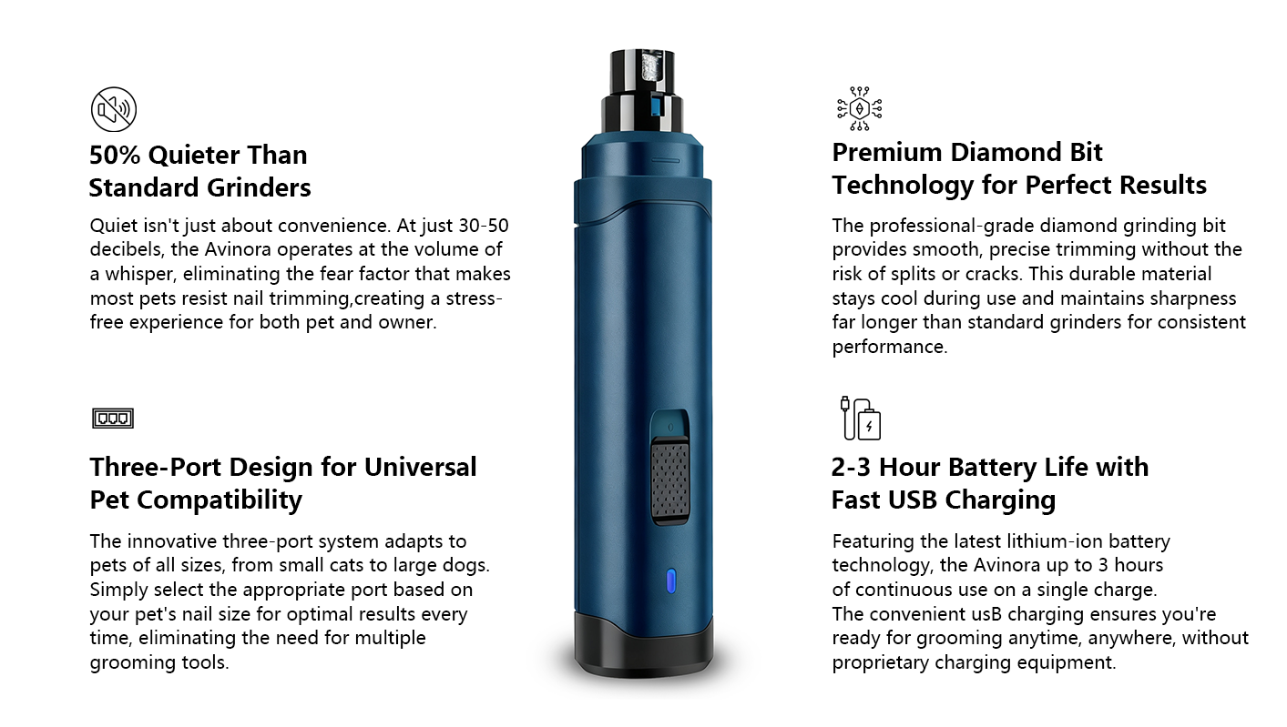 Avinora features whisper-quiet 30dB motor technology and diamond-bit precision grinding with three adjustable ports for all pet sizes, ensuring stress-free grooming in just minutes.